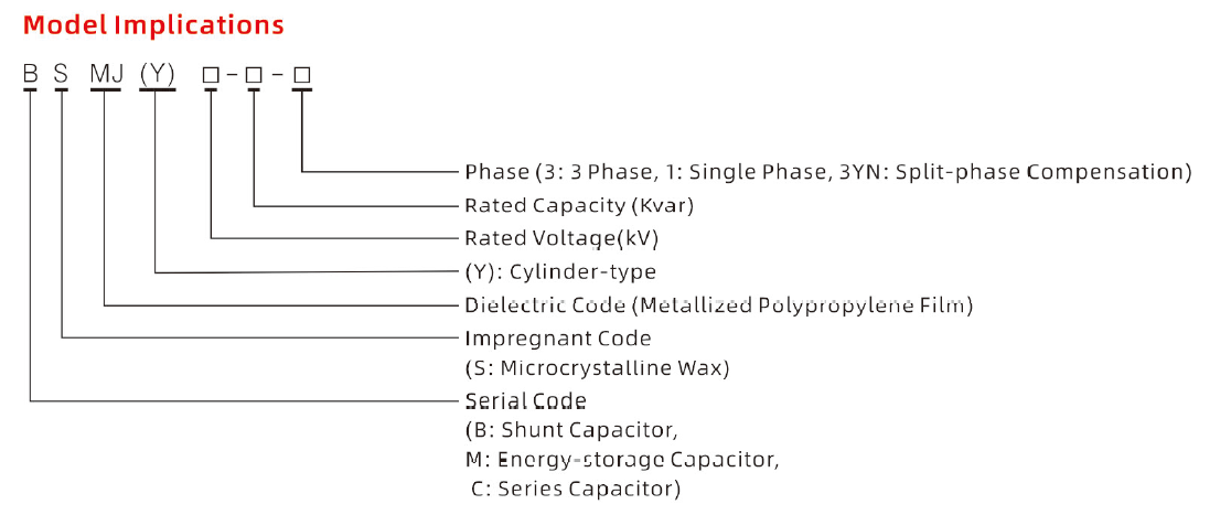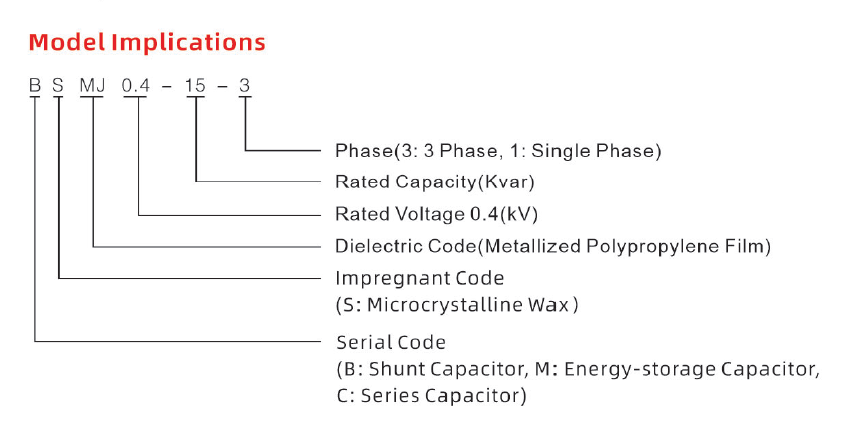 Hoewel de Chinese nationale normen voor de mechanische industrie niet expliciet de exacte serieaanduiding specificeren voor zelfherstellende shuntcondensatoren met lage spanning, regelen ze wel strikt hoe fabrikanten een serie vermogenscondensatoren moeten benoemen met behulp van letterarrangementen. BSMJ is eenvoudigweg een algemene aanduiding voor een stroomcondensatorserie die voldoet aan de industriestandaard naamgevingsregels.